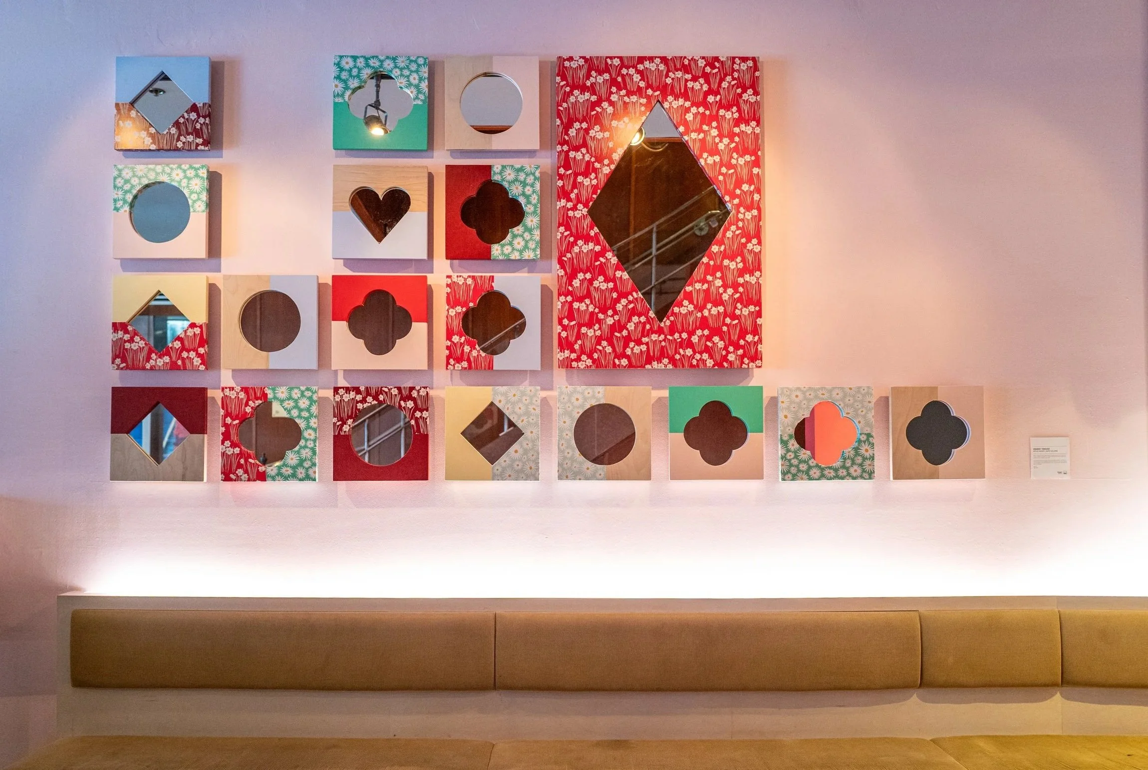 The piece blends together both artists' interests in Newfoundland's architecture and landscape to produce a custom mirrored and wallpapered art piece comprising of 31 mirrors. The mirrors are adorned with floral wallpapers, traditional Newfoundland paint colours, and symbols used in the decoration and details of local buildings.